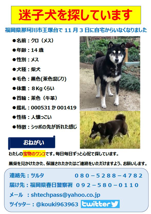 黒柴 クロちゃんの目撃情報 迷い犬 2020年11月15日 2020/11/11 福岡市中央区六本松で目撃情報あり。 2020/11/15 チラシをみた人から福岡県那珂川市片縄にて目撃情報あり。 見かけたからはご連絡お願いします。 [0回]PR